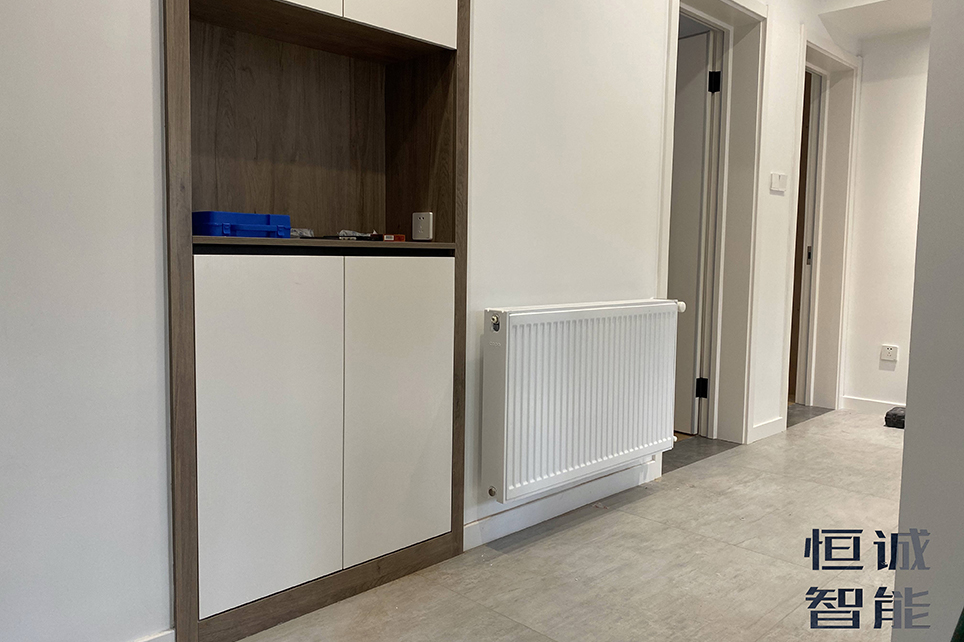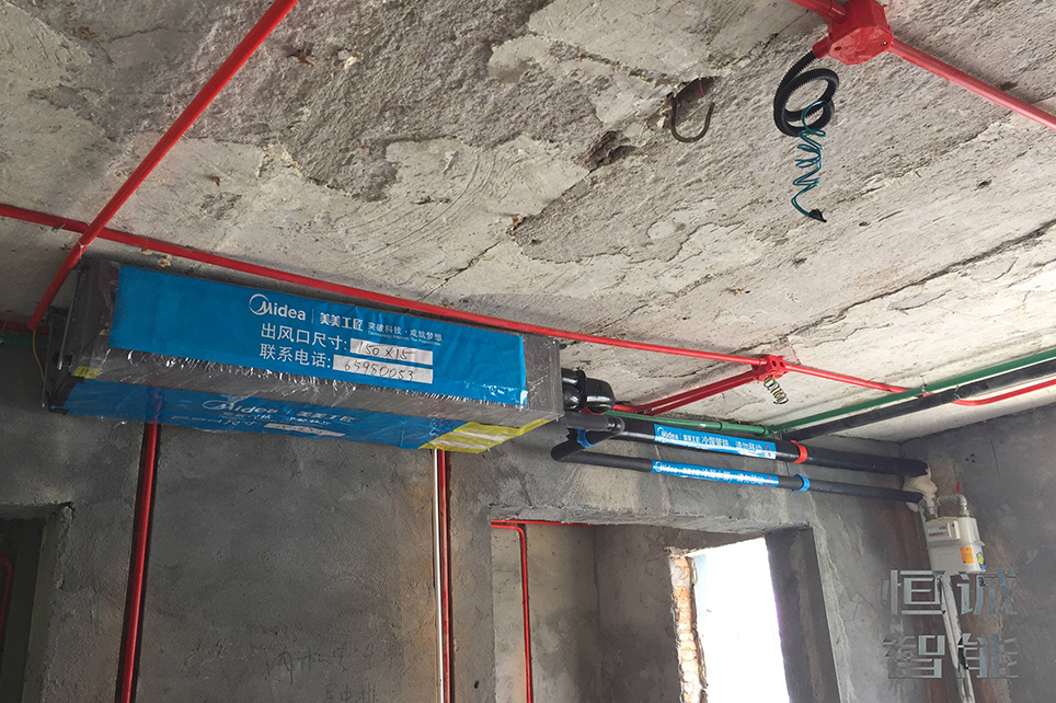 本案是老房新裝修的案例。客餐廳采用美的一拖一風管機,內機和管路全部隱藏,結合吊頂的處理,美觀大氣。采暖采用威能壁掛爐和暖氣片的搭配,冬季采暖效果更好,且能同時提供生活熱水。